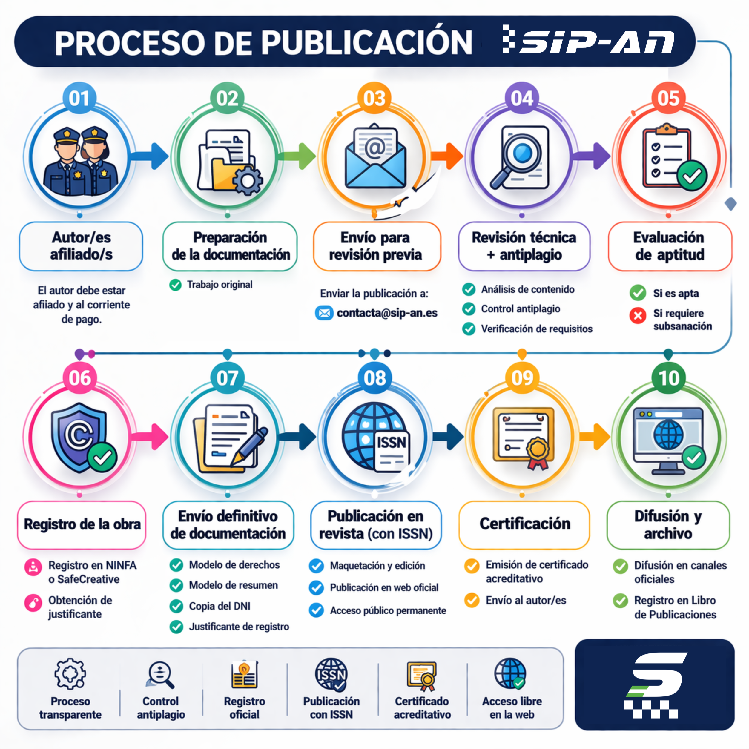 Con la finalidad de que ninguna persona pueda realizar plagio de una obra elaborada por otro autor y poder garantizar que con la suya suceda lo mismo, el afiliado que aporte una publicación de las consideradas «de interés policial» para su publicación en la biblioteca virtual de SIP-AN, deberá registrarla en la propiedad intelectual de la Junta de Andalucía (Ninfa) o en su defecto en Safecreative